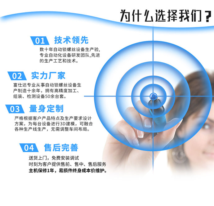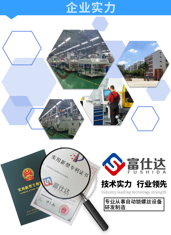 富仕達擁有獨立研發設計團隊,200多位自動化高級工程師,5000㎡自動鎖螺絲機生產、測試車間,專業售后服務團隊,為客戶提供方案設計、設備制造、操作培訓、售后服務等一站式服務。 公司將持續提升技術創新和產品服務方面的優勢,堅持“專業、精工、服務”的企業理念,聚焦于自動鎖螺絲設備生產,通過系統的一站式解決方案,真正的幫助客戶提升效率、降低成本,提升客戶的核心競爭力。